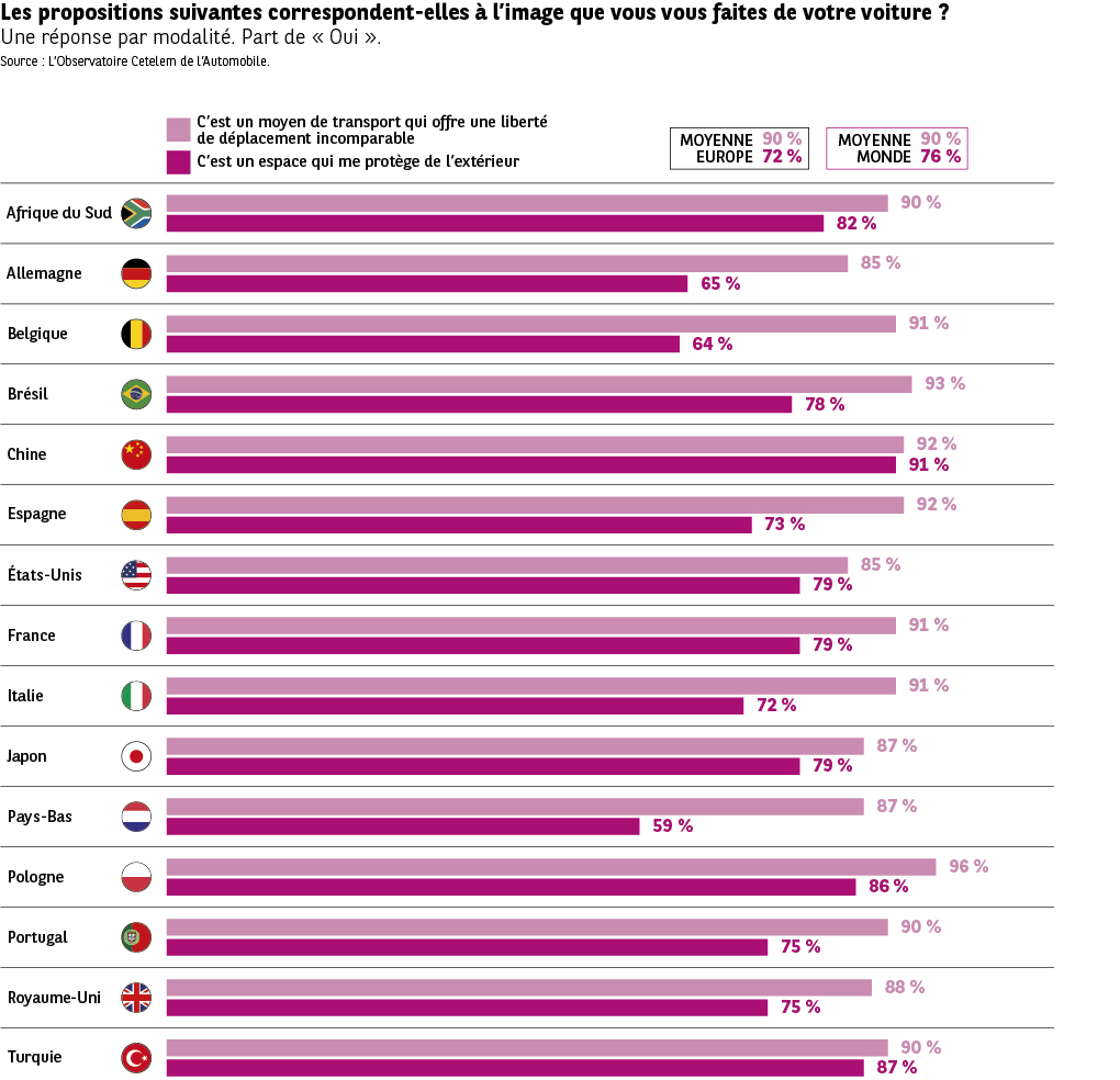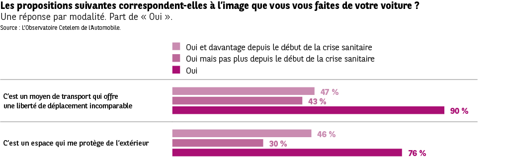 Valeur liberté donc, mais aussi valeur refuge. 76 % affirment en effet qu’à l’intérieur de leur véhicule, ils se sentent protégés de l’extérieur. Et là encore, ce sentiment s’est affermi durant la crise dans 46 % des cas.