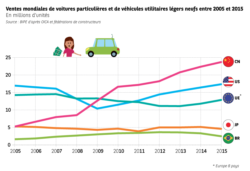 En Chine, le ralentissement macroéconomique a entraîné, comme en 2014, une nouvelle réduction du taux de croissance des ventes. Après dix dernières années d’une expansion fulgurante, le premier marché mondial (27 % du total en 2015) a bouclé l’année en progression de moins de 6 %, pour 23,7 millions de véhicules. En début d’année, la dynamique des ventes était atone, subissant les contre-coups d’achats d’anticipation panique, suite à des rumeurs fin 2014 de restriction des droits à l’immatriculation dans certaines villes. Pire, pour la première fois depuis le décollage du début du millénaire, des glissements annuels négatifs ont été enregistrés durant les mois d’été.