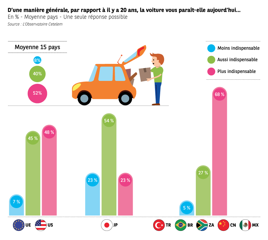 Au-delà de cet enthousiasme individuel sans faille et quasi généralisé, l’automobile jouit d’une popularité actuelle plus forte que celle du passé. Avec des taux de motorisation en pleine expansion, il n’est pas surprenant de voir que les consommateurs des pays émergents attribuent massivement à l’automobile une place au moins aussi importante (95 %), voire plus importante (68 %) qu’il y a vingt ans. Mais autre surprise, en Europe et aux États-Unis, respectivement 49 % et 43 % des personnes interrogées ont la même opinion.