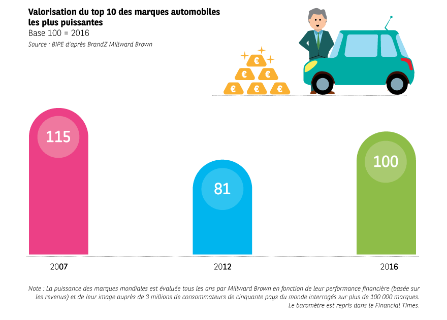 Un autre indicateur témoigne de cette reconnaissance de la voiture et de la place privilégiée qu’elle occupe dans le cœur des automobilistes. En 2016, la valeur des dix marques automobiles les plus puissantes, évaluée dans le baromètre BrandZ Millward Brown en fonction de la performance financière et de l’image auprès de consommateurs du monde entier, s’établit à un niveau de 23 % supérieur au point bas observé en 2012.