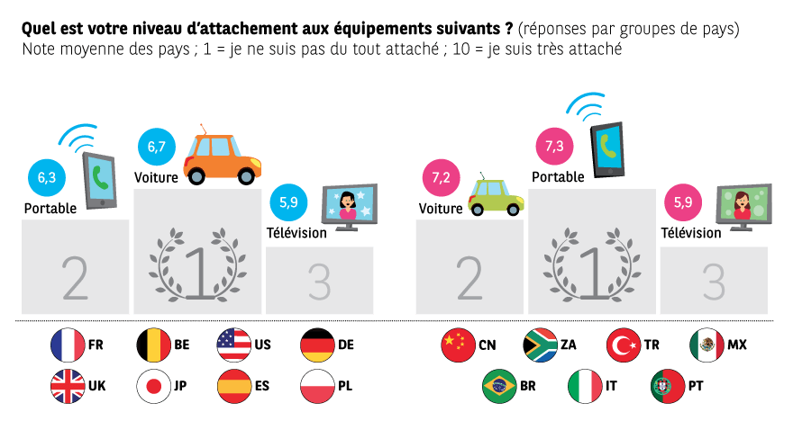 Cette reconnaissance est aussi bien ancrée dans le réel. Dans un match qui la met aux prises avec le téléphone portable et la télévision, l’automobile fait mieux que se défendre. Dans les pays développés, elle obtient facilement la meilleure note : 6,7 vs 6,3 pour le portable et 5,9 pour la télévision. Dans les pays émergents, le portable l’emporte de peu.