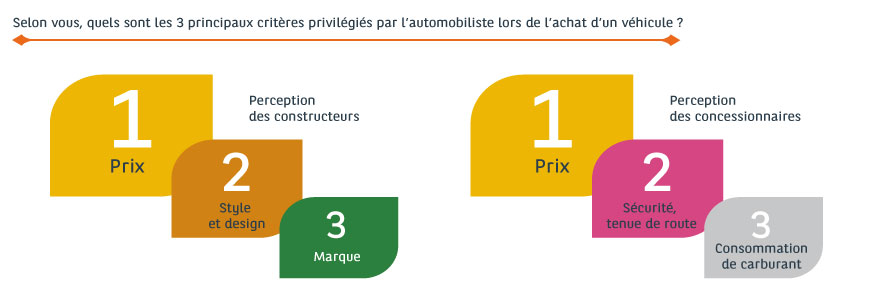 Pour le reste, rien de commun : en second lieu arrive le critère « puissance, performances » du véhicule, suivi par le « confort intérieur ». La « consommation de carburant » et le « prix » n’apparaissent respectivement qu’en 4e et 6e positions.