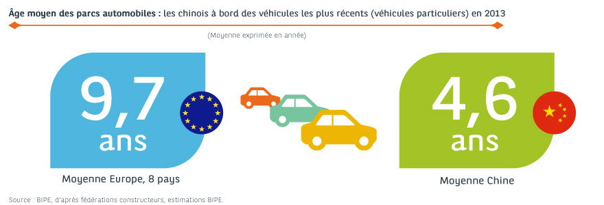 L’âge du stock automobile en circulation indique une qualité de parc variable d’un pays à l’autre. En Europe, notamment, les disparités sont fortes et induites par la chute des marchés autos (Europe du Sud), l’échec des primes à la casse, l’importance des achats de sociétés (Royaume-Uni : les sociétés renouvellent souvent leur parc), l’entrée dans l’U.E. et l’importation de voitures d’occasion (Pologne). Ailleurs, la pénalisation des véhicules anciens au Japon stabilise le vieillissement ; les USA nous montrent quel avenir l’Europe se prépare sur le sujet ; et la Chine fait toujours figure d’exception !