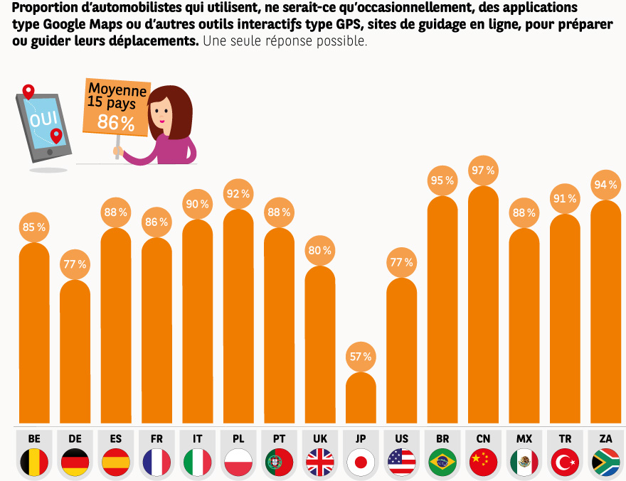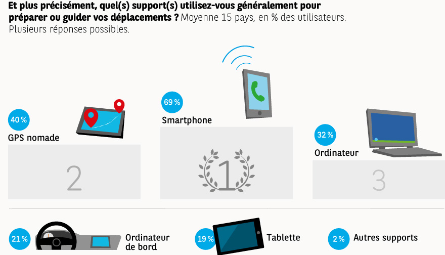 L’application Google Maps, que l’on peut installer gratuitement sur la plupart des smartphones, figure parmi les applications mobiles les plus utilisées au monde. Il n’est donc pas surprenant que 69 % des automobilistes mondiaux interrogés privilégient le smartphone pour préparer ou guider leurs déplacements, devant le GPS nomade (40 %) et l’ordinateur (32 %). Aux États-Unis, ils sont même 88 % à être habitués à naviguer grâce au smartphone.