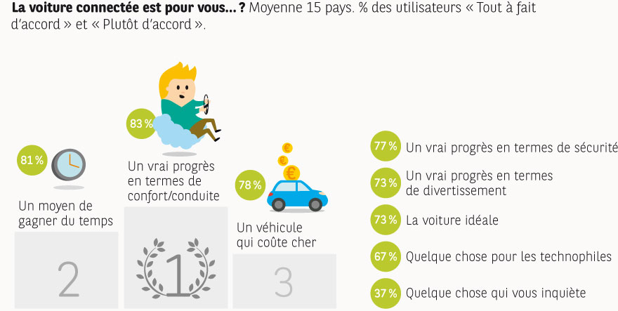 Pour 83 % d’entre eux en moyenne, elle est synonyme de véritable progrès en termes de confort de conduite, pour 81 % de gain de temps et pour 77 % de progrès de termes de sécurité. Toutefois, 78 % considèrent que la voiture connectée rime avec cherté.
