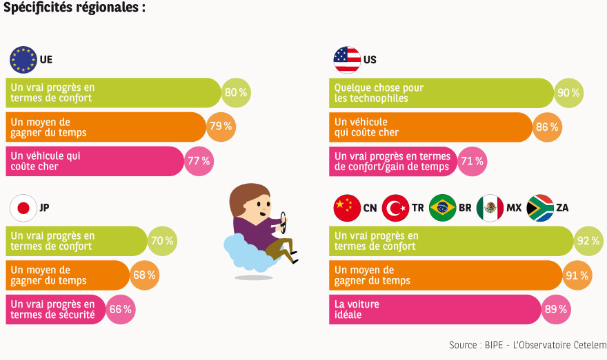Les inquiétudes et réticences vis-à-vis de la voiture connectée se situent plutôt du côté des autres pays occidentaux. Les Européens savent que cela aura un coût. Les Américains considèrent à 90 % que la voiture connectée est réservée aux technophiles : un comble pour le pays où circule déjà la Google Car dans certains états (Californie, Texas) !