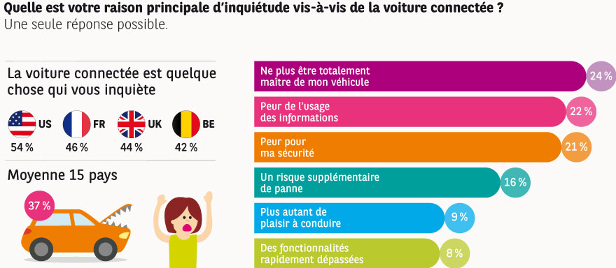 Si la voiture connectée représente avant tout une avancée majeure pour les automobilistes, dans certains cas – peu nombreux- elle suscite aussi des craintes : 37 % avouent que la voiture moyenne). connectée les inquiète, ils sont 54 % aux États-Unis et 46 % en France. Les Allemands, quant à eux, déclarent redouter le plus l’usage des informations communiquées par la voiture et l’éventuelle perte de contrôle sur les données privées. Les Italiens, amoureux de l’automobile, sont plus nombreux à craindre de devoir renoncer au plaisir de conduire (17 % vs 9 % en moyenne).