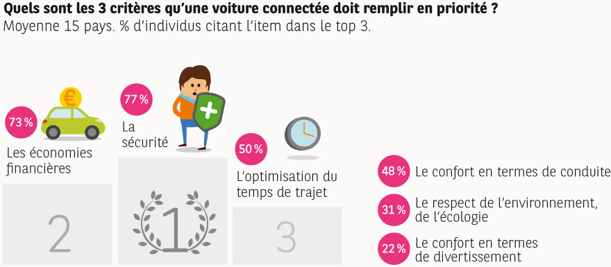Pour trouver son public, le véhicule connecté devra en premier lieu garantir la sécurité des personnes et des véhicules. La réalisation d’économies financières ainsi que l’optimisation des temps de trajet sont aussi des attentes fortes.