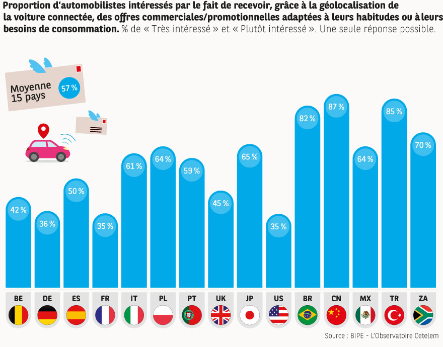La géolocalisation de la voiture connectée permettra au consommateur de recevoir des offres commerciales ou promotionnelles adaptées à ses habitudes ou besoins de consommation. Et cette possibilité ravit 57 % des automobilistes en moyenne.