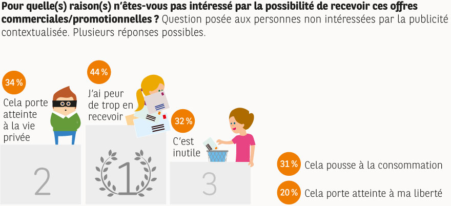 Pour les 43 % d’automobilistes qui déclarent ne pas être intéressés, la crainte provient avant tout de voir l’automobile se transformer en nouveau media publicitaire. Les automobilistes redoutent en effet que cette publicité personnalisée ne devienne trop invasive (44 %), et estiment même à 34 % que cela porte atteinte à leur vie privée.