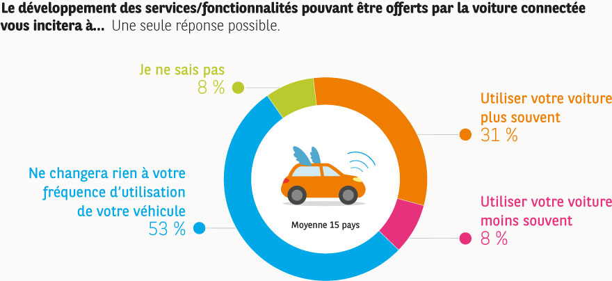 Au bilan, si pour 53 % des automobilistes interrogés, le véhicule connecté ne changera rien à leur fréquence d’utilisation du véhicule, 31 % estiment que les bénéfices apportés par les fonctionnalités connectées les inciteront à choisir plus souvent la voiture pour se déplacer, contre seulement 8 % d’intentions d’usage moins intense. En améliorant l’expérience de conduite et le temps passé en voiture, l’automobile connectée pourrait ainsi constituer un levier de (re)-conquête du consommateur.